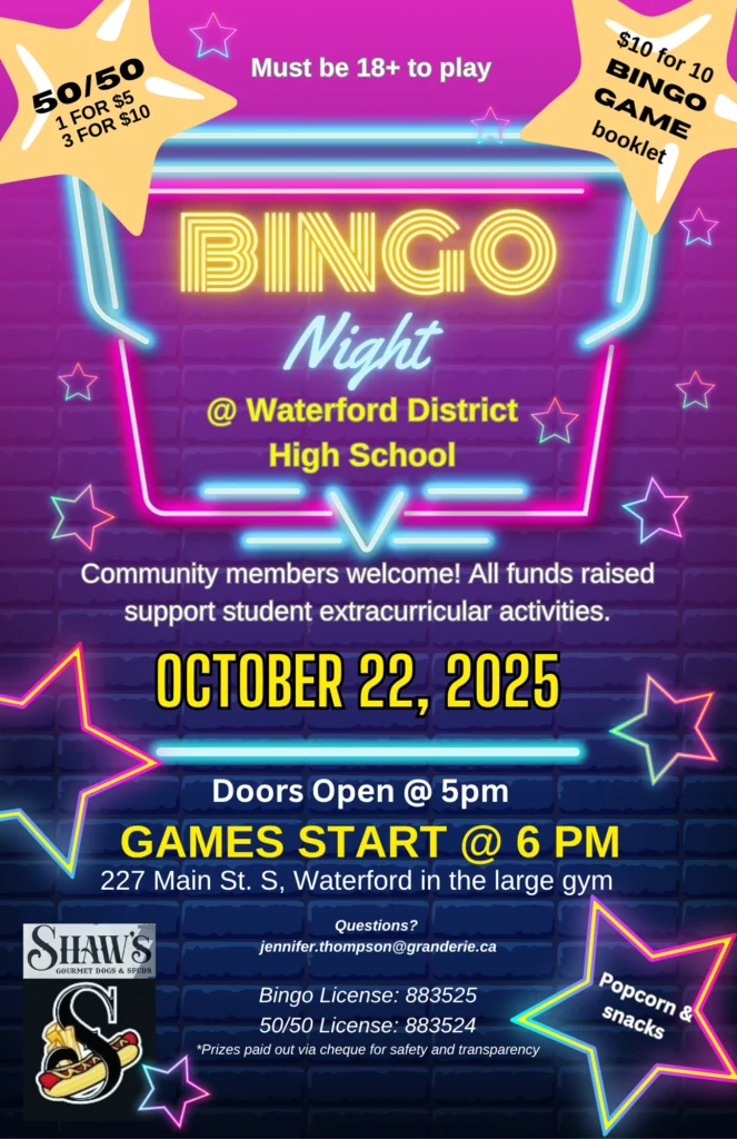 Get ready, Waterford — Bingo Night is back at WDHS on October 22, 2025! Doors open at 5:00 PM, and games kick off at 6:00 PM inside the large gym at 227 Main St. S, Waterford.