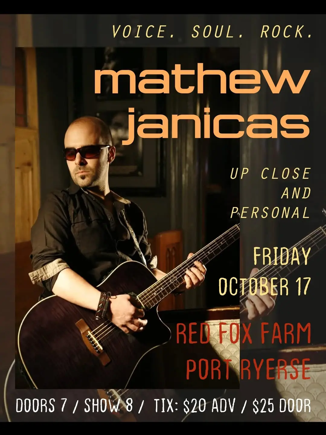 Mathew Janicas – the lead vocalist of Norfolk County’s INDEBT and Northern Soul Brotherhood – is getting up close and personal. On Friday October 17th at the beautiful, cozy Red Fox Farm in Port Ryerse, Mathew will be accompanied by a small ensemble as he performs a selection of his favourite high energy rock anthems along with stirring, heartfelt ballads that you won’t hear him sing with his other acts. Come and experience the soul, the stories, and the deeper, more authentic side of rock through Mathew’s distinctive, soaring voice. Get your tickets now! ($20 advance, $25 at the door)