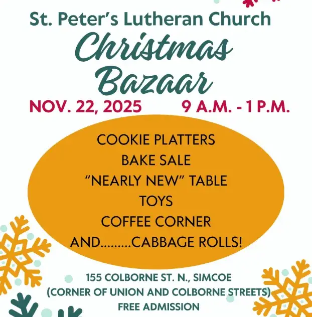 St. Peter’s Lutheran Church (corner of Colborne and Union St. in Simcoe) is hosting a Christmas Bazaar on Sat., Nov. 22, 2025 from 9 a.m. to 1 p.m.