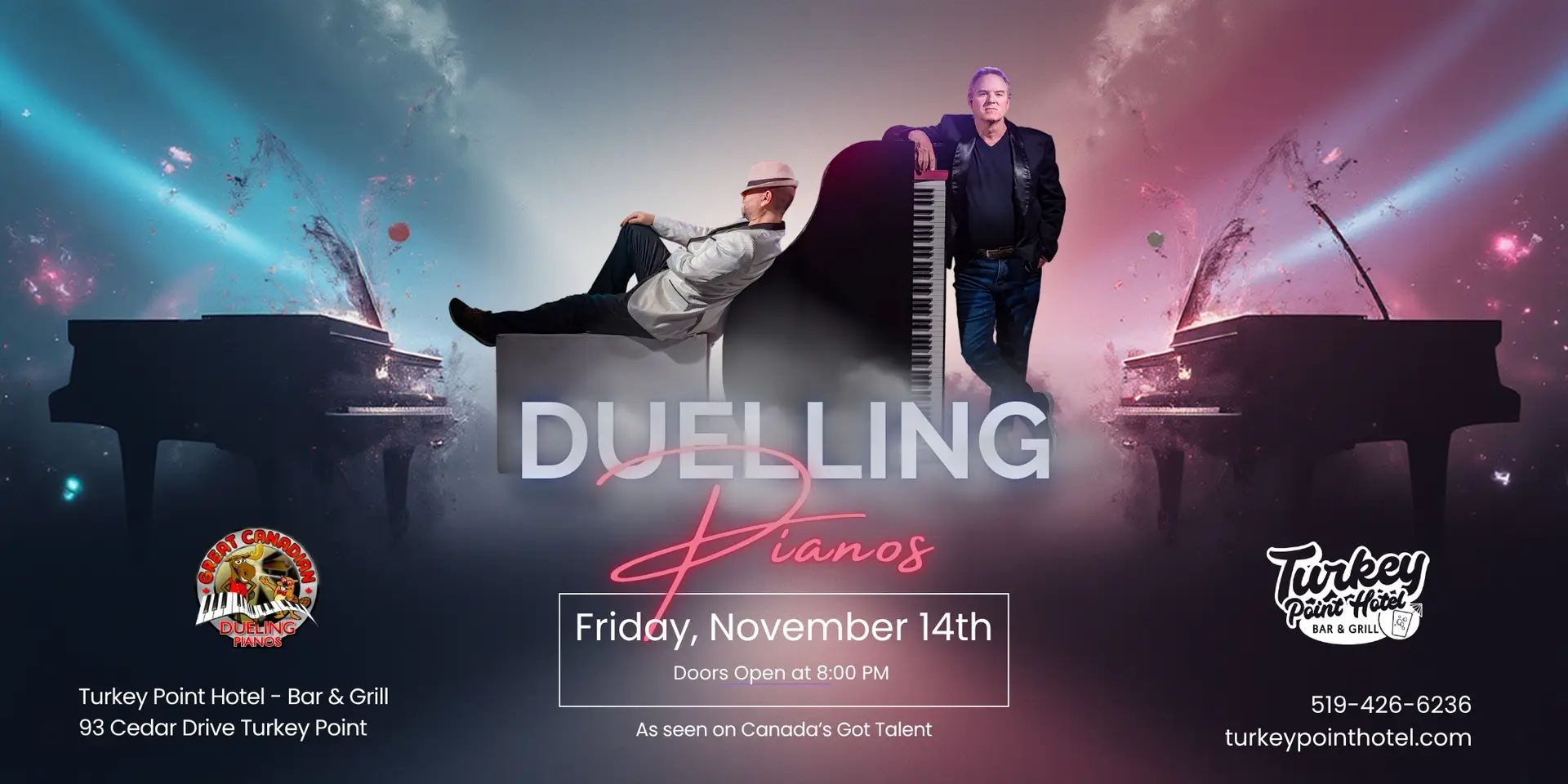The Great Canadian Duelling Pianos are hitting the stage at The Turkey Point Hotel – Bar & Grill with a drummer for a wild, request-driven, sing-your-heart-out show!