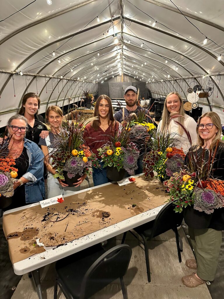 The garden centre hosted its very first Fall Planter Workshop, welcoming 14 participants of all ages and skill levels. Some arrived solo and made new friends; others came with a buddy or two, turning it into a night out. With fall music playing, lights strung up in the greenhouse, and refreshments on hand, the atmosphere was warm and inviting.