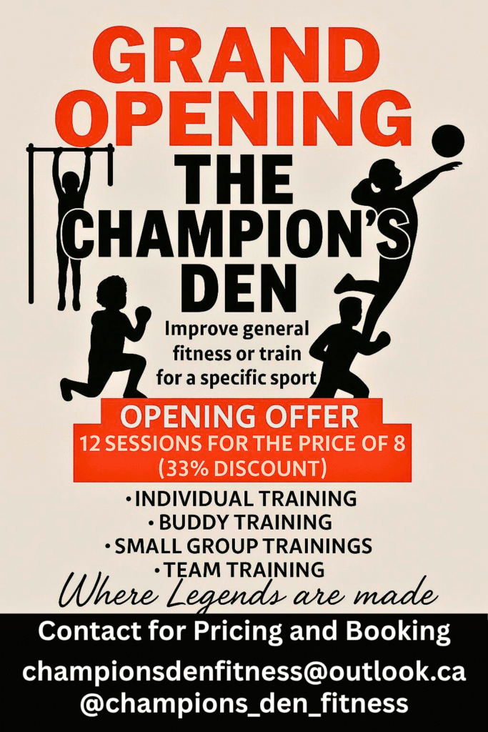 Programs are by appointment only, with 8-week and 12-week training blocks currently available. For a limited time, The Champion’s Den is offering a grand opening deal — 12 weeks for the price of 8, a 33% discount.
