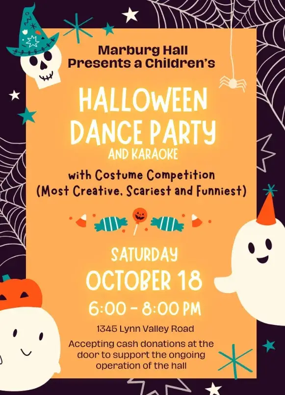Marburg Hall 1345 Lynn Valley Rd, Port Dover, ON, CanadaChildren's Halloween dance, costume contest, and Karaoke Party. Bring your friends! Halloween themed treats and light refreshments provided. Candy and bracelets for sale at event. Suggested entrance fee: A goodwill cash donation at the door to support Marburg Hall operations