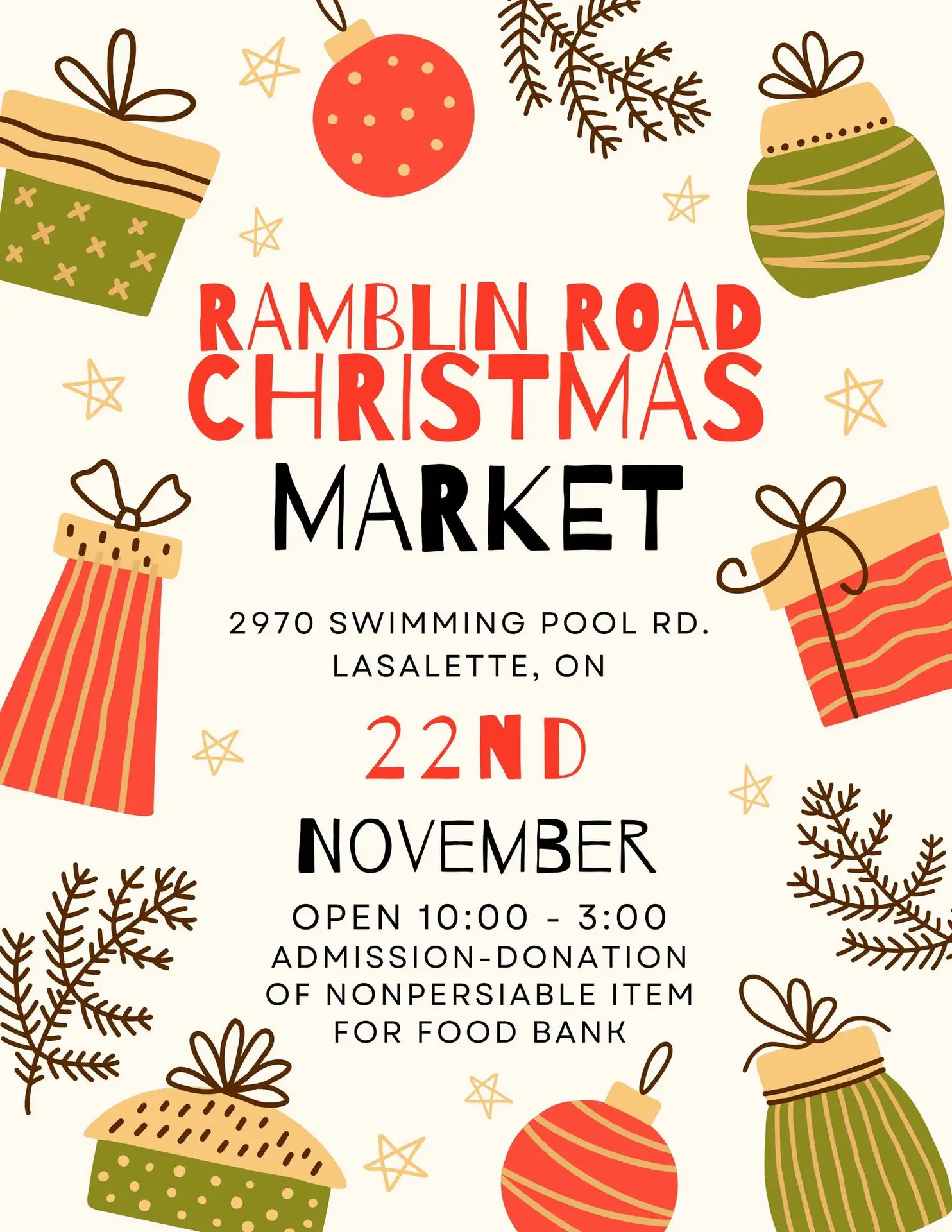 Welcome to the Ramblin' Road Christmas Market 10-3pm.Admission: a nonperishable food item