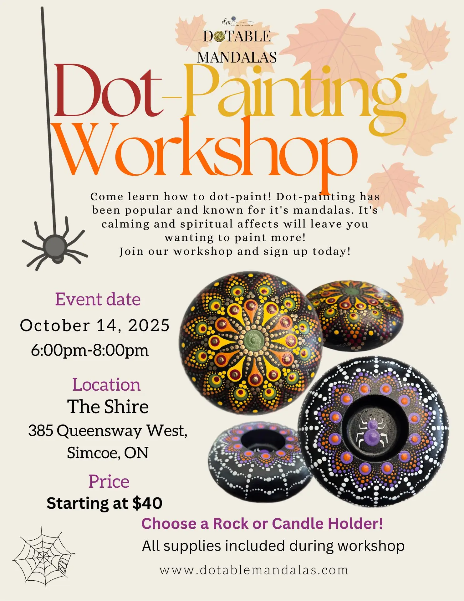 The Shire Restaurant 385 Queensway West, Simcoe, ON, CanadaGet creative this season with our hands-on dot-painting workshop!Join us for a fun and relaxing experience where you’ll paint your very own 4" rock or 4" candle holder in your choice of two beautiful seasonal themes:  Halloween Spider Web – A spooky yet elegant design perfect for the season. Autumn Leaves – A cozy fall-inspired piece […]