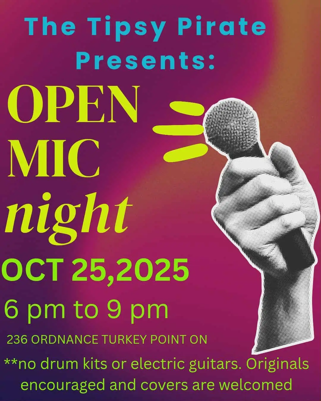 October 25 @ 6:00 pm - 9:00 pm Tipsy Pirate Open Mic Night Tipsy Pirate 236 Ordnance Dr, Turkey Point, ON, Canada