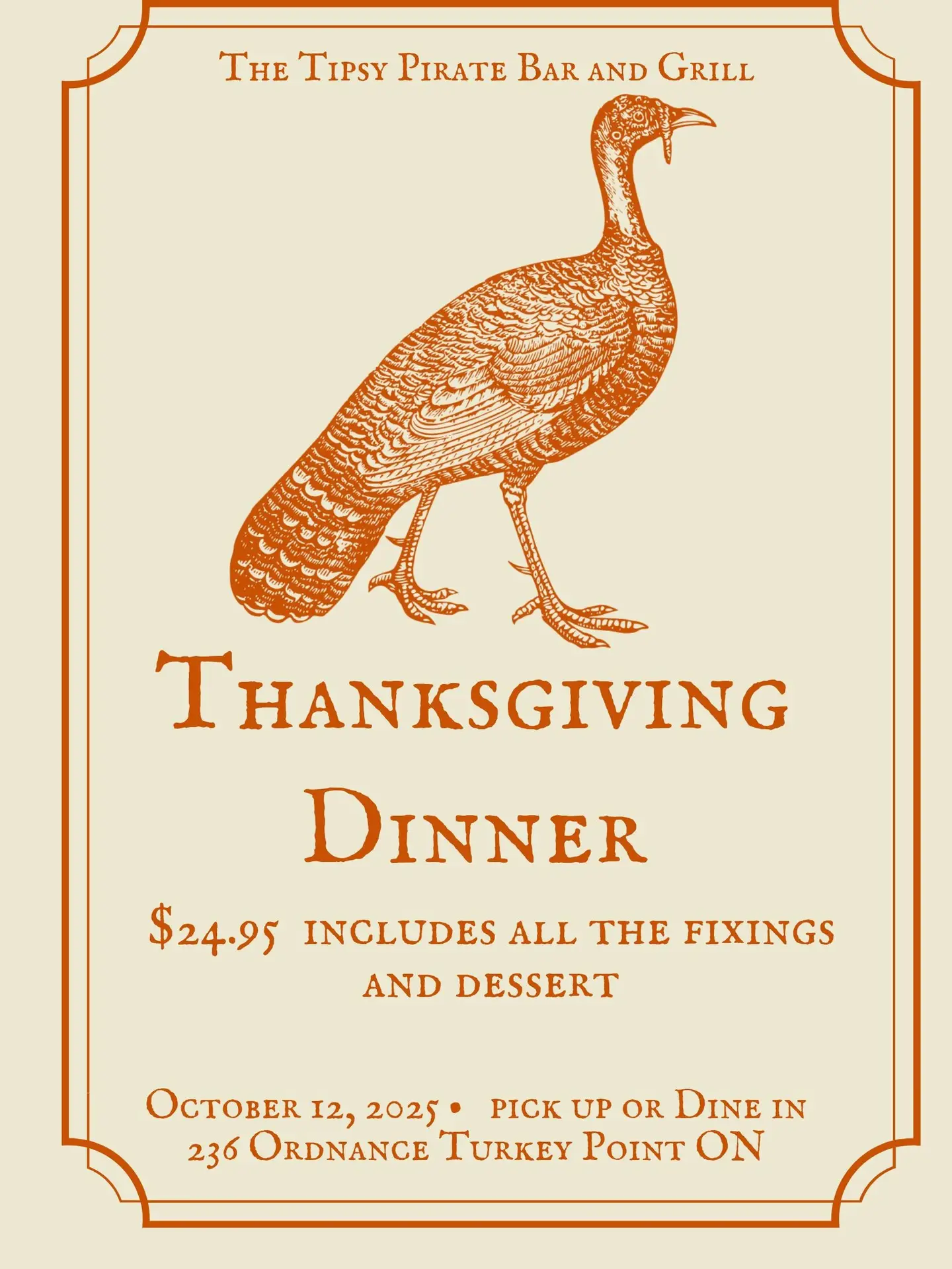 October 12 🦃Thanksgiving Dinner – Tipsy Pirate Tipsy Pirate 236 Ordnance Dr, Turkey Point, ON, Canada